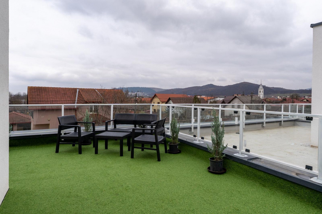 - LA ETAJ: 2 dormitoare, 2 băi si casa scării care duce la terasa circulară de pe acoperis. De asemenea în acest preț este inclus și 1 loc de parcare în curtea privată.