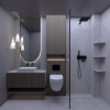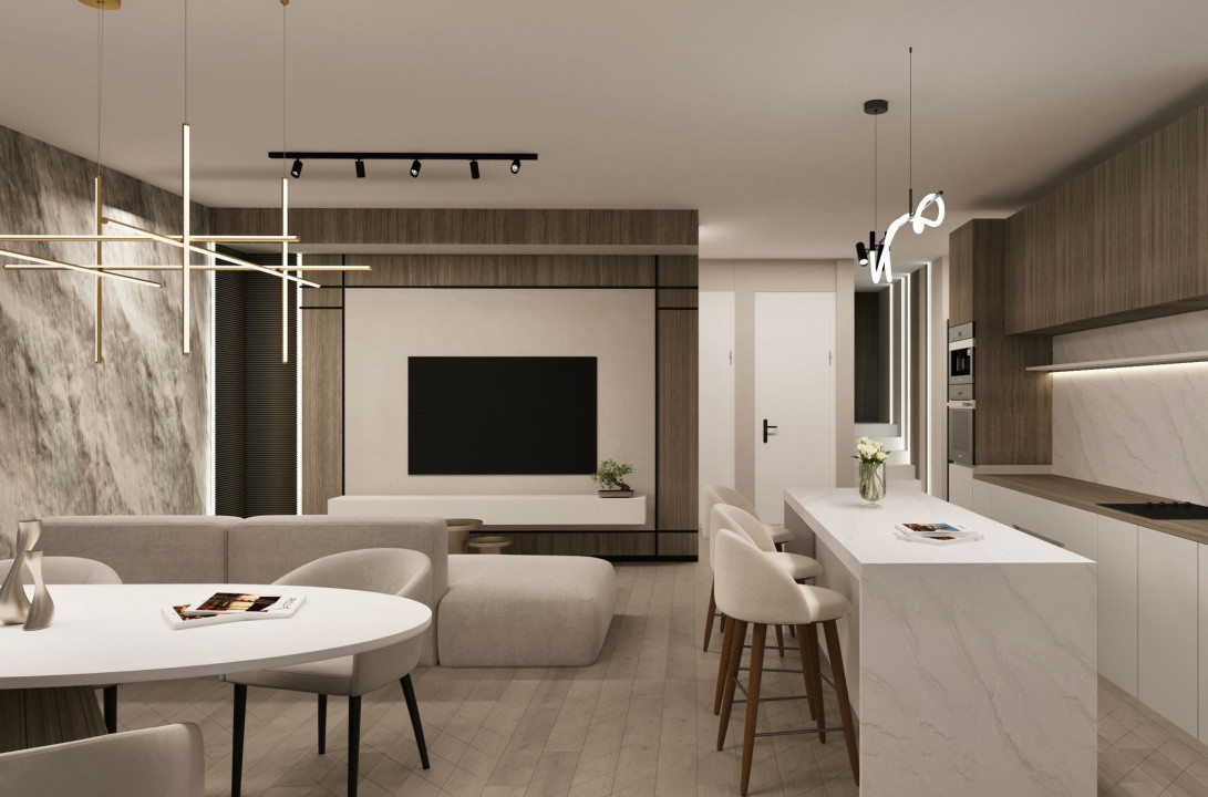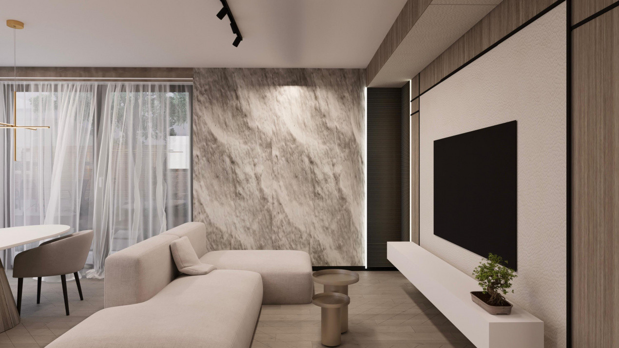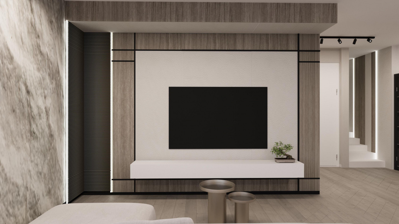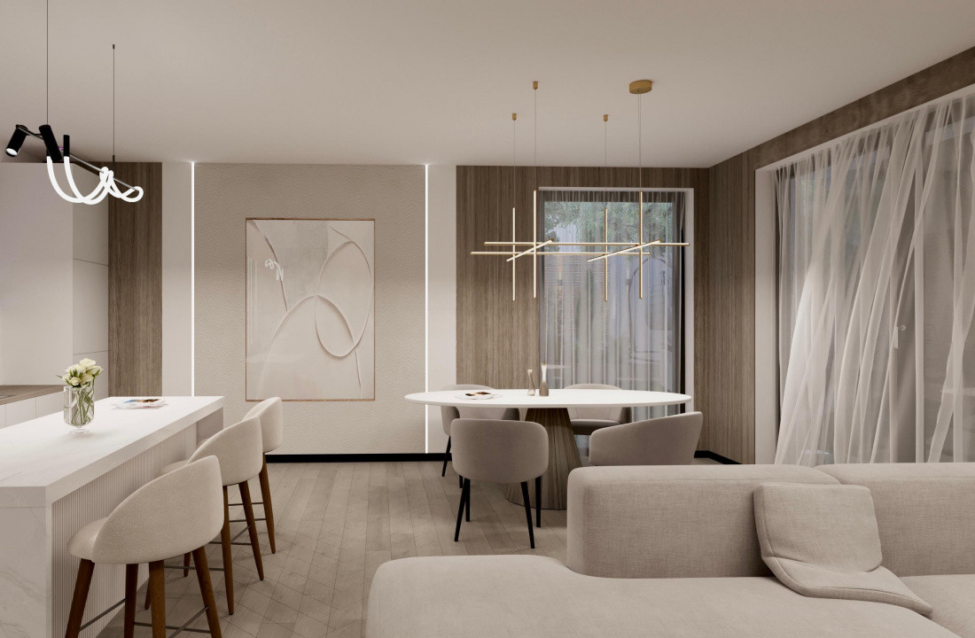 La parter: hol, living cu bucatarie tip open space, baie, dormitor, debara, terasa cu acces din zona de living;